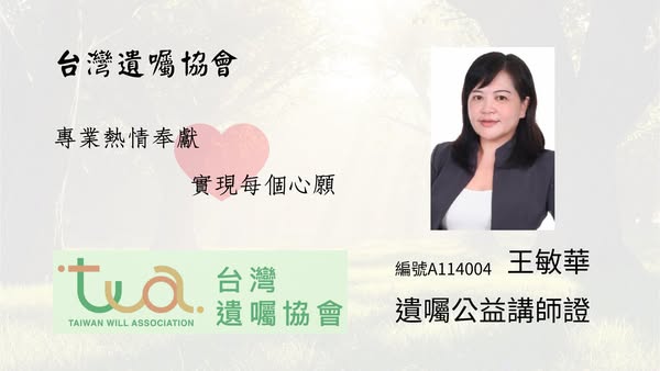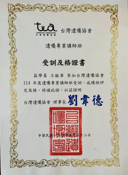 台灣遺囑協會 遺囑專業講師 王敏華 國際認證高級理財規劃顧問CFP® 2025/08/11感謝《台灣遺囑協會》理事長~劉韋德律師用心培訓我們成為《遺囑專業講師》。近半年時間的培訓,劉律師親自為我們講授遺囑相關的法律課程,還有精心設計的考試測驗題目。目的就是要訓練我們成為遺囑協會公益講師,推廣《預立遺囑 圓滿人生》,協助社會大眾製作有效遺囑,讓社會更祥和,心願都能實現。《台灣遺囑協會》的宗旨~專業熱情奉獻實現每個心願現在只要揪團滿10人以上(亦可用機關/團體/社區/學校/等單位邀課),即可免費預約「預立遺囑圓滿人生」公益講座。歡迎各位上官網預約喔!https://sites.google.com/view/twwillassoc讓專業的我們,為您和您的親友帶來一場實用且意義深遠的知識饗宴~