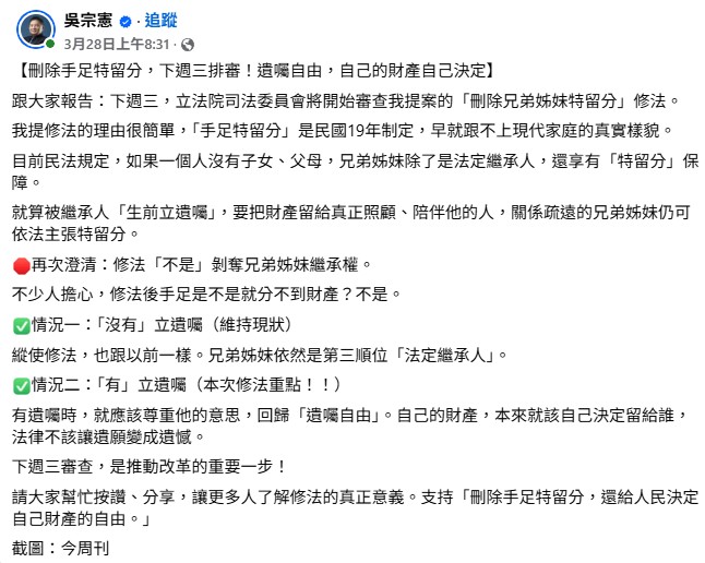 115/03/28向所有關心《刪除兄弟姊妹特留分》法案進度的朋友們報告《最新訊息》 王敏華 國際認證高級理財規劃顧問CFP® 20260328向所有關心《刪除兄弟姊妹特留分》法案進度的朋友們報告《最新訊息》~《刪除手足特留分,下週三排審!遺囑自由,自己的財產自己決定》